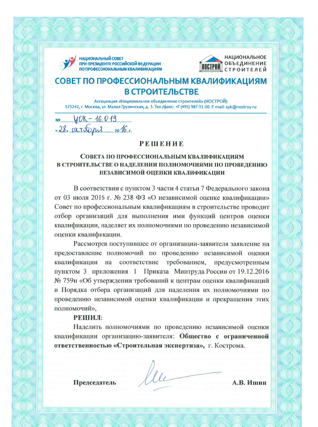 Решение Совета по профессиональным квалификациям в строительстве о наделении полномочиями по проведению независимой профессиональной экспертизе